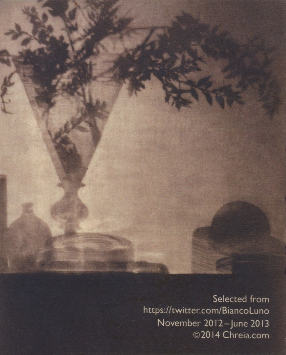 Bianco Luno styles himself a spiritual terrorist and poet-logician, who combines both existential and analytic modes of philosophy. These minibooks package homeopathic remedies for dark moods, tinctures made from toxins that make us sick. For a select few, though, the tweets' acknowledgment of what is amiss with our constitution offers modest consolation. And Abby's work adds silver lining, like a beautiful label on a bottle of bitter medicine back when such labels alone had the charm to effect a cure.