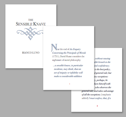 In this brief, accessible essay, contemporary philosopher Bianco Luno reminds us Hume's knave, aka psychopath, still haunts our world. The handcrafted mini book is 21 pages and approximately 3.1 x 3.6 inches.